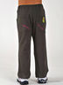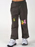 Модель прямого кроя. В пояс вставлена резинка. Множество карманов. Изделие украшено аппликациями.