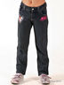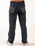 Джинсовые брюки прямого кроя застегиваются на пуговицу и молнию. К поясу пришиты шлевки. Три передних кармана, два задних кармана. Изделие украшено аппликациями и вышивкой.