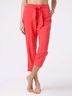 Брюки женские укороченные, из однотонной текстильной ткани. По бокам карманы. Верх брюк обработан притачным поясом завязывающийся по переду и с эластичной тесьмой по спинке. Низ брюк обработан швом в подгибку.