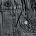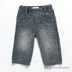 Модель прямого кроя. Имитация застежки на пуговицу и молнию. В пояс вшита резинка, пришиты шлевки. Два передних кармана. Имитация задних карманов. Контрастная прострочка, эффект потертости.