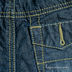 Модель прямого кроя. Имитация застежки на пуговицу и молнию. В пояс вшита резинка, пришиты шлевки. Два передних кармана. Имитация задних карманов. Контрастная прострочка, эффект потертости.
