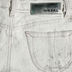 Модель слегка-зауженного кроя застегивается на пуговицу и молнию. К поясу пришиты шлевки. Три передних кармана, два задних кармана. Изделие украшено стразами, и декорировано эффектом загрязнения.