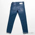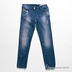 Модель слегка зауженного кроя застегивается на пуговицу и молнию. К поясу пришиты шлевки. Три передних кармана, два задних кармана. Эффект потертости.
