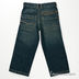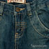 Модель свободного кроя застегивается на пуговицу и молнию. Пришиты петли для ремня. Два передних кармана, три задних кармана, один из которых застегивается на молнию. Левый задний карман украшен декоративной вышивкой.