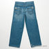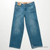 Модель свободного кроя застегивается на кнопку и молнию. Пришиты петли для ремня. Три передних кармана, один из которых на кнопке, два задних кармана с декоративными клапанами. Декоративная прострочка и вышивкана переднем кармане.