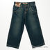 Модель свободного кроя застегивается на пуговицу и молнию. Пришиты петли для ремня. Два передних кармана, три задних кармана, один из которых застегивается на молнию. Левый задний карман украшен декоративной вышивкой.