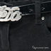 Детали: застежка на молнию и пуговицу, втачной пояс с ремнем, продетым в шлевки, четыре кармана, изделие декорировано стразами