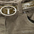 Детали: застежка на молнию и хлястик с пуговицей, втачной пояс с лаковым ремнем, продетым в шлевки, пять карманов