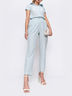 Зауженные брюки из тонкого хлопка в зеленую полоску с высокой посадкой. Для удобства в боковых швах предусмотрены карманы. По бокам пояс присобран на резинку. Застегиваются на молнию и пуговицу.