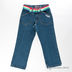 Джинсовые брюки прямого кроя застегиваются на пуговицу и молнию. К поясу пришиты шлевки, вставлен ремень. Два передних кармана, два задних кармана. Карманы украшены вышивкой и аппликациями.