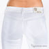 Модель прямого кроя застегивается на пуговицу и молнию. К поясу пришиты петли для ремня. Три передних кармана, два задних кармана. Декоративная вышивка в тон ткани на задних карманах.