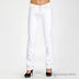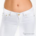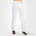 Модель прямого кроя застегивается на пуговицу и молнию. К поясу пришиты петли для ремня. Три передних кармана, два задних кармана. Декоративная вышивка в тон ткани на задних карманах.