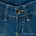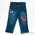 Джинсовые брюки прямого кроя застегиваются на пуговицу и молнию. К поясу пришиты шлевки. Два передних кармана, два задних кармана. Изделие украшено вышивкой, пуговичками и нашивками.
