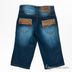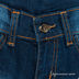 Джинсовые брюки прямого кроя застегиваются на пуговицу и молнию. К поясу пришиты шлевки. Три передних кармана, два задних кармана. Изделие украшено вышивкой и контрастными вставками.