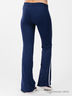 Спортивные эластичные брюки расклешенного кроя. Отрезной пояс на кулиске и веревочке. Модель украшена контрастными вставками и принтом.
