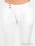 Детали: широкий втачной пояс и шлевки для ремня, застежка на молнии и на пуговице, два прорезных кармашка, сзади листочки имитируют кармашки, брючины заужены к низу.