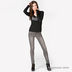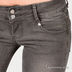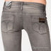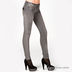 Брюки имеют классический пятикарманный крой. Ткань низкоэластичная, джинсовая. Застежка на пуговицу и молнию. Пояс дополнен шлевками для ремешка.