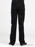Модель прямого кроя застегивается на пуговицу и молнию. В пояс вставлена резинка, пришиты шлевки. Два передних кармана, два задних кармана. Декоративная нашивка на правом боковом шве.