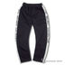 Спортивные брюки прямого силуэта. В пояс вставлена резинка. Контрастные лампасы с надписями.