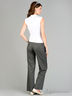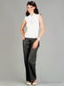 Классические брюки слегка расклешенного кроя. Отрезной пояс, застегивается на крючки и затягивается на шнуровку. Спереди 2 втачных кармана. Сзади прорезной карман, украшены кнопками.