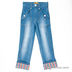 Детали: застежка на пуговицу и молнию, к поясу пришиты шлевки, два передних кармана, два задних кармана, яркие декоративные отвороты, эффект потертости
