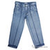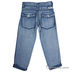 Джинсовые брюки застегиваются на пуговицы и молнию. Передние и задние карманы. К поясу пришиты шлевки. Простроченные стрелки.