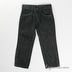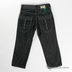 Брюки прямого кроя, застегиваются на молнию и пуговицу. Есть шлёвки для пояса. Оформлены черной и серой прострочкой. Шесть карманов, задние украшены вышивкой и декоративными клепками.