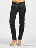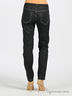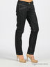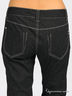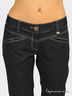 Легкие брюки прямого покроя в тонкую белую полоску. Отрезной пояс, есть шлевки для ремня. Треугольная кокетка спереди и сзади. Застегиваются на молнию и пуговицу. Два прорезных кармана спереди, два накладных сзади.