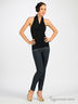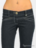 Легкие брюки прямого покроя в тонкую белую полоску. Отрезной пояс, есть шлевки для ремня. Треугольная кокетка спереди и сзади. Застегиваются на молнию и пуговицу. Два прорезных кармана спереди, два накладных сзади.