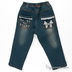 Детали: Брюки джинсовые. Пояс - резинка. Прорезные карманы спереди. Накладные карманы сзади. Декоративные текстильные вставки на карманах. Контрастный принт спереди и сзади. Эффект аутентирования.