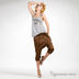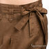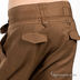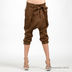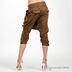 Женские брюки-афгани укороченные коричневого цвета. Широкий пояс-кокетка со шлевками для декоративного ремешка. Застежка на молнии и пуговицах. Два кармана спереди. Сзади имитация карманов с клапанами. Манжеты брюк на пуговицах с возможностью регулировать ширину. Спереди изделия декоративные простроченные складки.