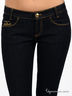 Детали: к поясу пришиты шлевки, застежка на пуговицу и молнию, два передних кармана, два задних кармана, контрастная прострочка