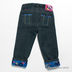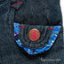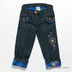 Джинсовые брюки прямого кроя застегиваются на кнопку и молнию. Два передних кармана, два задних кармана. Изделие украшено вельветовыми вставками, вышивкой и паетками.