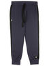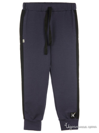 Брюки на манжетах, в боковых швах карманы. В поясе эластичная тесьма и шнур. По бокам декоративные вставки. Изготовлены из петельчатого футера с эластаном.