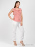 Великолепные брюки из полухлопковой, полульняной ткани. Отрезной пояс со шлевками для ремня. Застежка на пуговицу и молнию. Спереди два прорезных кармана, сзади два прорезных с листочками. Длинные прямые брючины с присборенными манжетами.