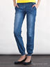 Детали: отрезной пояс со шлевками для ремня, застежка на пуговицу и молнию, два прорезных кармана спереди, два накладных сзади, манжеты на резинке