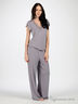 Брюки из тонкого трикотажа прямого кроя. По верху изделия идет широкая плотная резинка. На штанинах декоративные банты.