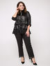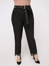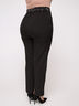 Классические брюки высокой посадки, укороченные по переду и дополненные вставками со стразами. Застегиваются брюки на 2 пуговицы и молнию. По спинке проходит резинка. Дополняют изделие косые карманы по бокам. Съемный тканевый пояс в комплекте, декорирован тесьмой с мелкими стразами.
