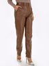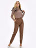 Стильные, элегантные брюки-бананы. Зауженный крой, высокая посадка. Притачной пояс застегивается на пуговицу и молнию, сзади - эластичная вставка. По поясу проходят шлевки для ремня. По бокам косые карманы, оформленные листочками. Необработанные края брюк. Длина изделия: по внешнему шву: XS-S 100 см, S-M 102 см, M-L 104 см, L-XL 106 см, по внутреннему шву: XS-S 72 см, S-M 73 см, M-L 75 см, L-XL 76 см. Параметры модели на фото: 85*68*90 см.