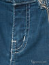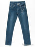 Детали: к поясу пришиты шлевки для ремня, застежка на пуговицу и молнию, по бокам и сзади расположены открытые карманы, изделие декорировано цепочкой и стразами