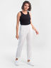 Брюки с высокой посадкой выполнены из костюмного полотна. Модель полуприлегающего силуэта, брючины слегка заужены к низу. Притачной пояс на резинке обеспечит комфорт и свободу движения.