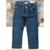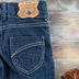 Модель прямого кроя. К поясу пришиты шлевки. Декоративные потертости, контрастная прострочка.