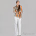 Слегка расклешенные книзу брюки из плотного хлопка. Застегивается на пуговицы. Два передних кармана, два задних с клапанами на пуговицах. Пояс и края карманов украшены декоративной прострочкой. Шлевки оформлены кружевом и клепками.