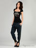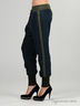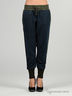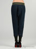 Оригинальные брюки свободного покроя из легкого темно-синего денима. Верх изделия посажен на широкую резинку с кулиской. Два прорезных кармана. Низ брючин на трикотажных манжетах в рубчик. Особый стиль модели придают зеленые вставки на поясе и по бокам.