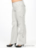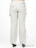 Детали: застежка на молнию и на две пуговицы, втачной пояс со шлевками для ремня, шесть карманов, по бокам кулиски со шнурками, регулирующим длину изделия