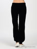Эластичные бархатные брюки прямого покроя. Верх изделия посажен на широкую резинку с кулиской. Брючины присобраны на манжетах.
