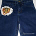Джинсовые брюки прямого кроя застегиваются на пуговицу и молнию. Карманы. Передняя часть украшена декоративным элементом.