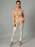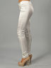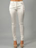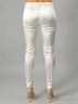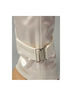 Детали: широкий втачной пояс и шлевки для ремня, шнуровка сзади позволяет сильно утягивать пояс без помощи ремня, застежка спереди на молнии и на пуговице, подчёркивающие фигуру, узкие по бёдрам и зауженные книзу брюки декорированы ремешком с металлической застежкой у щиколотки.