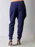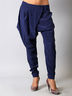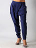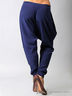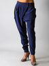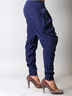 Детали: широкий пояс, застежка на пуговице, брючины заужены к низу, плотно сидят на щиколотке, одна брючина с сборкой к поясу.