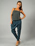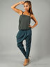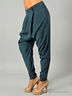 Детали: широкий пояс, застежка на пуговице, брючины заужены к низу, плотно сидят на щиколотке, одна брючина с сборкой к поясу.